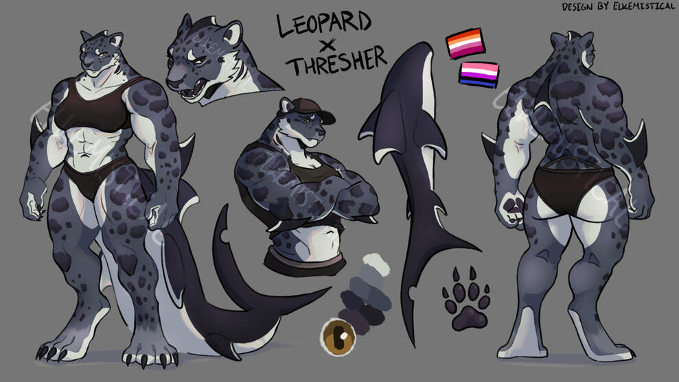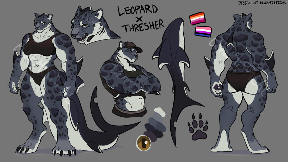 Anthro or Feral: AnthroSFW or NSFW: SFWSpecies: Leopard x Thresher HybridGender/Sex: Genderfluid, Masculine, Female and Male details (Describe how you see fit!)Body Type: Tall, Muscular, SleekParticular Color Requests: Grey-blues, dull colorsParticular Accessories/Detail Requests: Thresher tail (include the long top fin!). Smaller fins on the forearms, head, and back.Image References: YOUR IMAGES ARE THE MOST IMPORTANT PART. Whether they are photographs, moodboards, other peoples ocs (FOR INSPIRATION) or more! They help me tremendously!!The Order that was Put In: