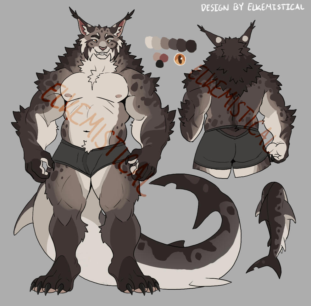 Anthro or Feral: AnthroSFW or NSFW: SFWSpecies: Shark x Lynx HybridGender/Sex: Masculine MaleBody Type: Tall, Muscular, both Fluffy and Sleek!Particular Color Requests: Natural tones, greyish brownsParticular Accessories/Detail Requests: Giant shark tail and an overbite with out-turned canines! Spotted/striped, white bellyImage References: YOUR IMAGES ARE THE MOST IMPORTANT PART. Whether they are photographs, moodboards, other peoples ocs (FOR INSPIRATION) or more! They help me tremendously!!The Order that was Put In: